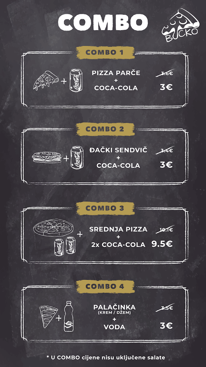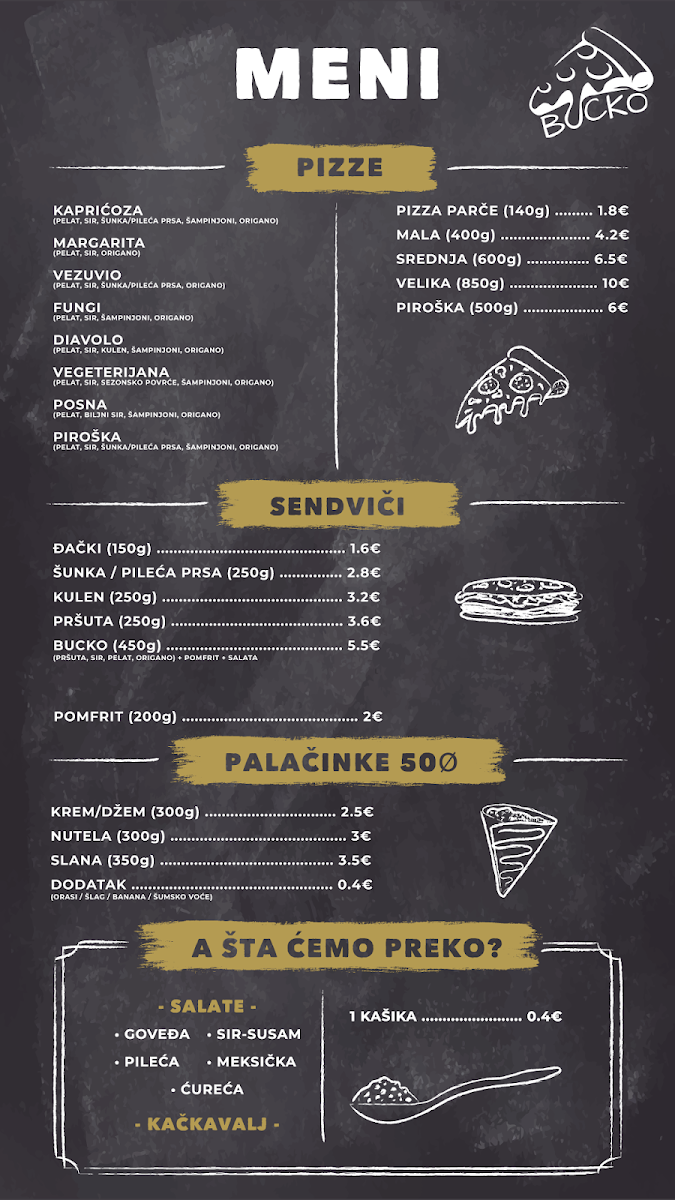 From a reviewer's perspective, Bucko Pizza on 53 Njegoševa in Podgorica impresses with a menu that balances classic flavors and hearty options. The Pizza L selection features generous offerings like Pivska Pizza 850 Gr, Pizza Diavolo 850 Gr, and Pizza Capricciosa Pileća Prsa 850 Gr, alongside lighter options such as Posna Pizza 780 Gr and Pizza Margherita 780 Gr. For those seeking something smaller, Pizza M includes Pizza Vesuvio Pileća Prsa 610 Gr, Pizza Vegetariana 700 Gr, Pizza Funghi 600 Gr, Pizza Margherita 580 Gr, and Pivska Pizza 630 Gr, while Pizza S provides even lighter choices like Pizza Capricciosa 400 Gr, Pizza Vesuvio 380 Gr, and Posna Pizza 360 Gr. The Piroška offerings-Piroška Šunka 500 Gr, Piroška Pileća Prsa 500 Gr, and Piroška Sa Sirom 450 Gr-are satisfying handheld options, and the Sendvič Iz Pizza Peći section shines with Sendvič Pršuta 250 Gr, Sendvič Pileća Prsa 250 Gr, Sendvič Kulen 250 Gr, Bucko Sendvič 450 Gr, and Sendvič Šunka 250 Gr. Combos like COMBO Srednja Pizza + 2 Coca-Cole 0.33l and COMBO 2 Male Pizze + 2 Coca-Cole 0.33l provide convenient, value-focused meals. Drinks are varied, from beers such as Heineken 0.25l and Zaječarsko 0.33l, to soft drinks including Rosa Gazirana Voda 0.5l, Coca-Cola Zero 0.33l, Next Limunada 0.33l, Schweppes Bitter Lemon 0.33l, and Sprite 0.33l, while Pomfrit 200 Gr offers a simple yet popular side. Overall, Bucko Pizza’s menu presents a well-rounded selection of pizzas, sandwiches, and accompaniments that cater to both indulgent cravings and lighter appetites, all clearly presented with portion sizes and pricing that make choices straightforward for diners.